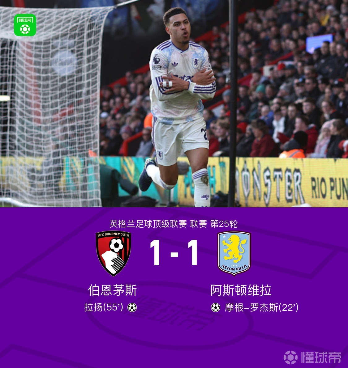 第22分鐘,摩根-羅杰斯右路勁射破門,維拉1-0領(lǐng)先伯恩茅斯