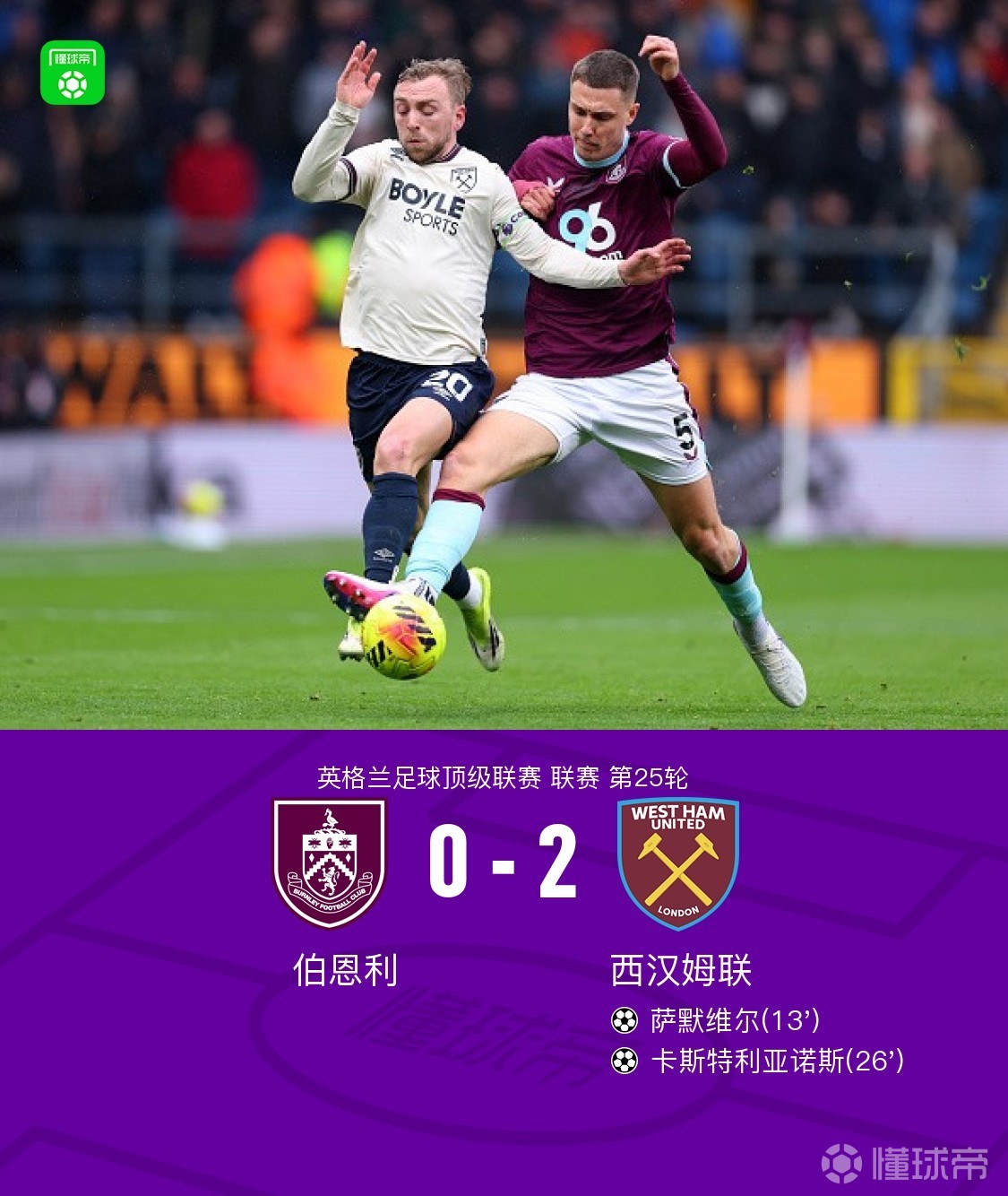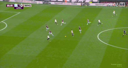 第25分鐘,迪烏夫傳中,卡斯特利亞諾斯頭槌破門,伯恩利0-2西漢姆聯(lián)